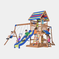 Backyard Discovery Beach Front Cedar Wood Swing Set with Wave Slide, Play Deck, Monkey Bars, Rock Wall Ladder, Shaded Picnic Area, Snack Bar, Belt Swings, Trapeze, Sandbox Area, Outdoor Playset