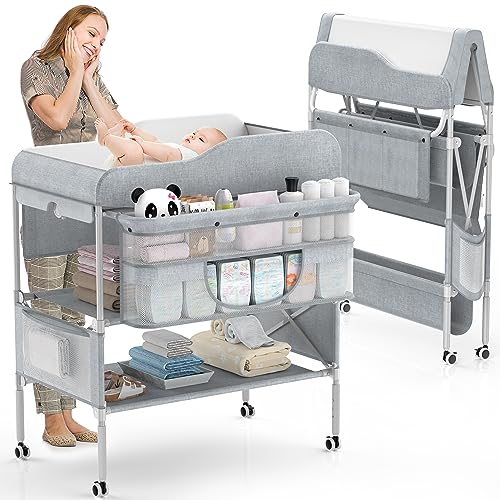 Portable Baby Changing Table, Foldable Changing Table Dresser Baby Changing Station, Height Adjustable Waterproof Diaper Changing Table Pad Topper, Newborn Nursery Organizer