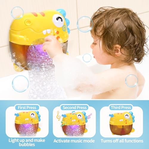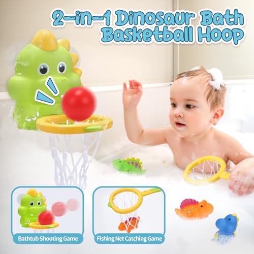 Baby Bath Toys, Dinosaur Automatic Bath Bubble Maker w/ 6 Soft Lights, Music, 2-in-1 Basketball Hoop& Fishing Game w/Bathtub Floating Toys, Wind-up Duck Shower Pool Toy for Kids Boys Girls