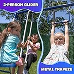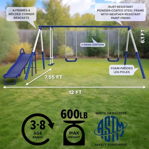OUTDOOR FUN: The Sportspower Arcadia Metal Swing set is feature packed with 6 play stations: 2 non-slip adjustable swing seats, 1 trapeze bar, 1 two-person glider, foam leg covers and 1 five-foot wavy slide. Up to 6 children to play at once!
